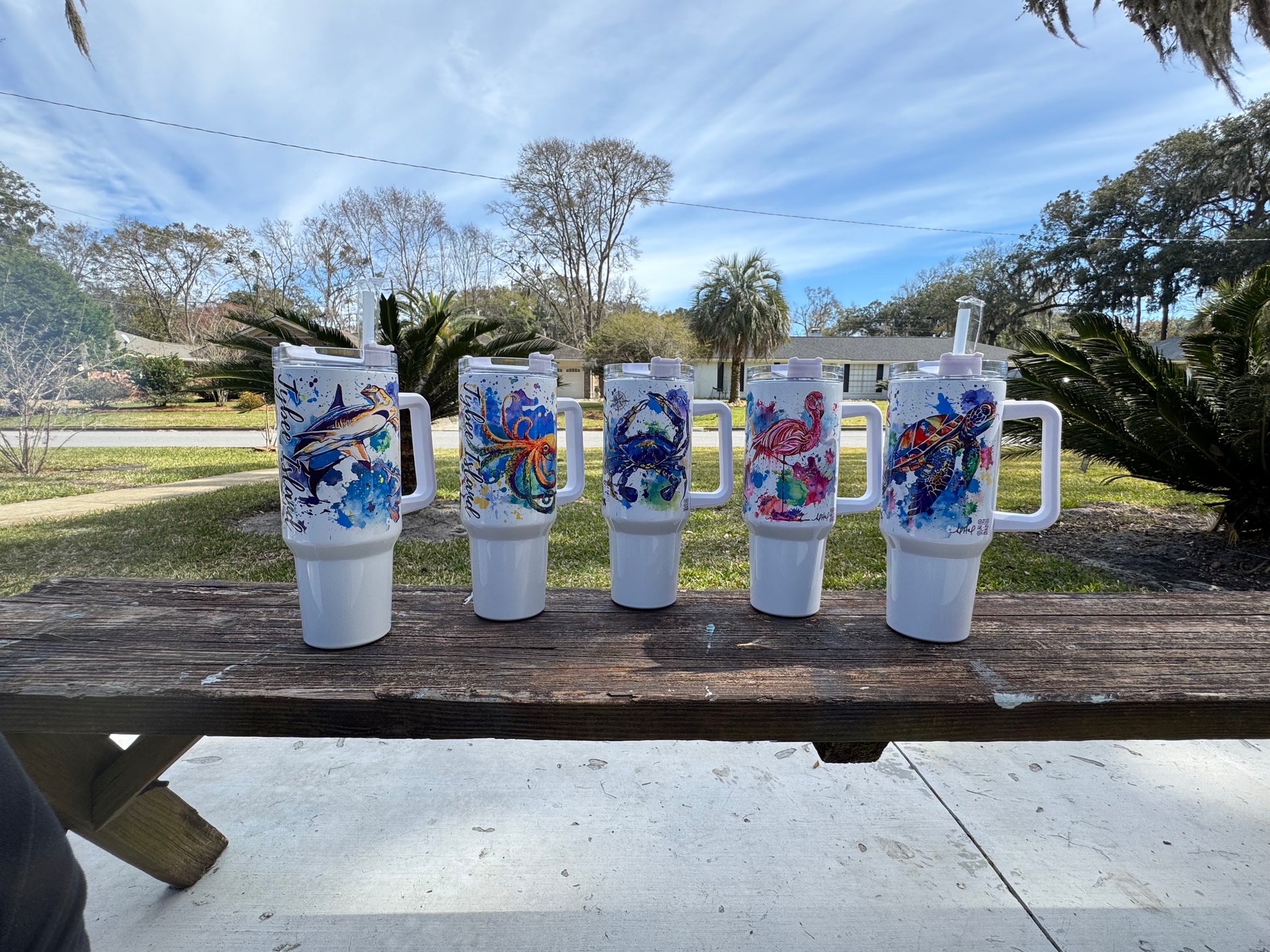 Stay hydrated in vibrant coastal style with this 40oz tumbler featuring Nugget—my original, colorful sea turtle artwork. With bold, cheerful hues and Nugget’s playful ocean charm, this tumbler is both eye-catching and incredibly functional. The large capacity, sturdy handle, and insulated design make it perfect for beach days, road trips, workouts, or everyday use. A must-have for sea-life lovers and anyone who enjoys sipping in bright, joyful coastal color.