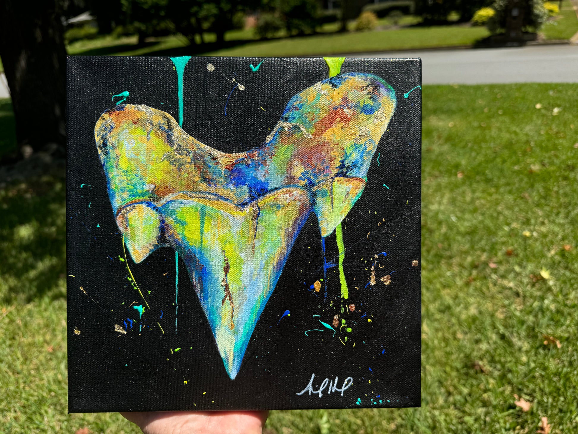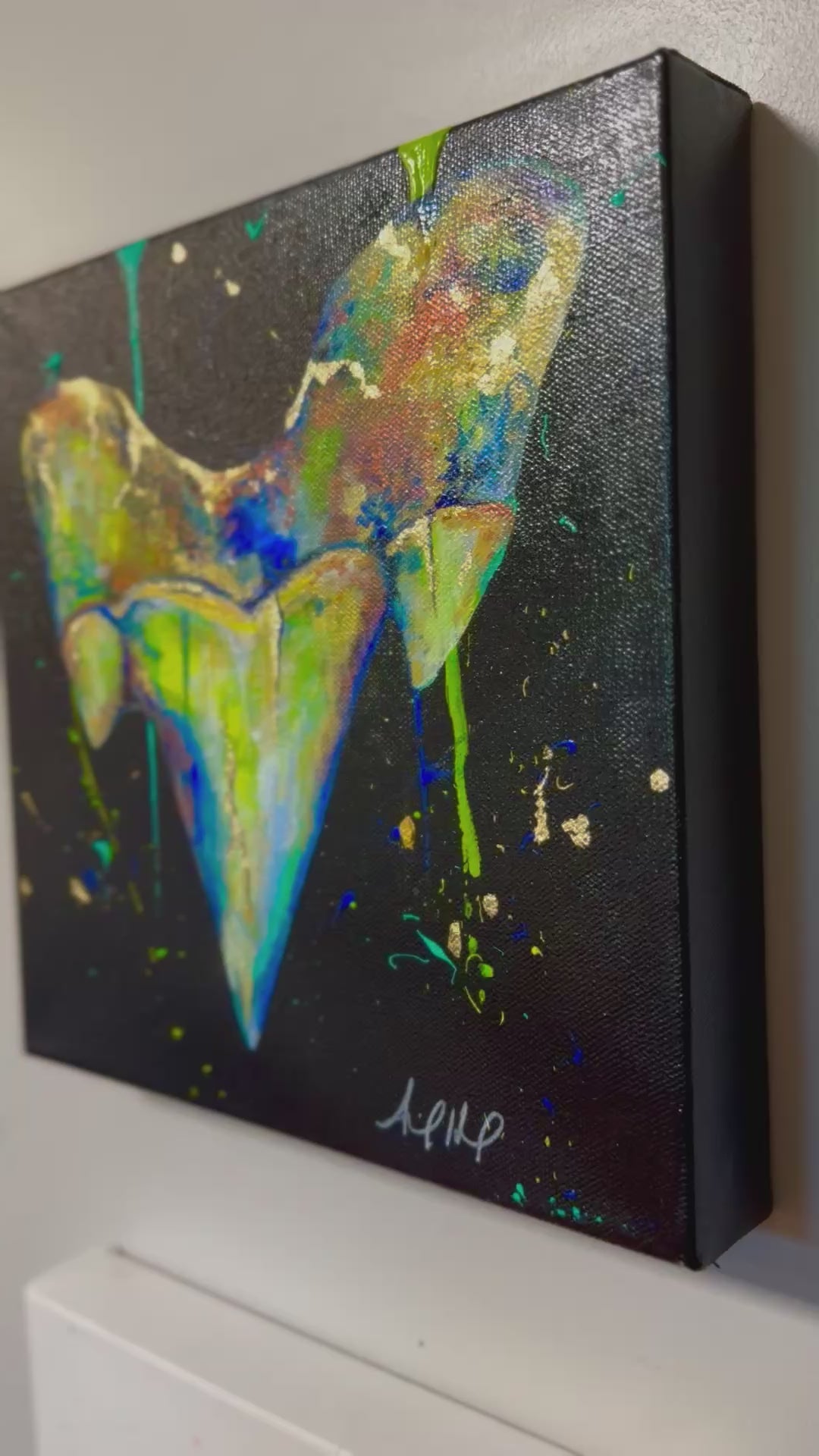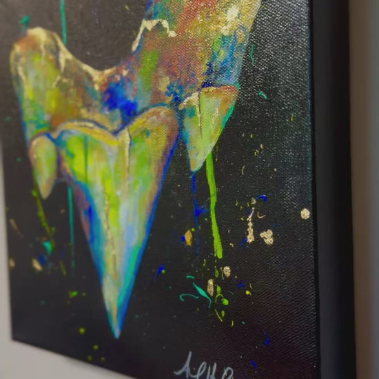 Dive into prehistoric wonder with my original megalodon shark tooth painting. Adorned with shimmering gold flakes and a subtle glow-in-the-dark effect, the piece captures the awe-inspiring power and mystery of the ancient sea. Bold, luminous, and striking, it’s a captivating treasure for lovers of ocean history and statement art.